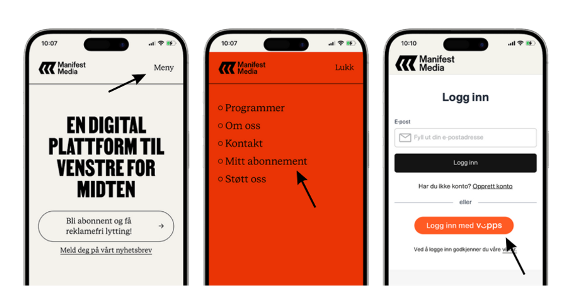 1. Trykk på «Meny» oppe i høyre hjørne, deretter «Mitt abonnement» og trykk på «Logg inn med Vipps».