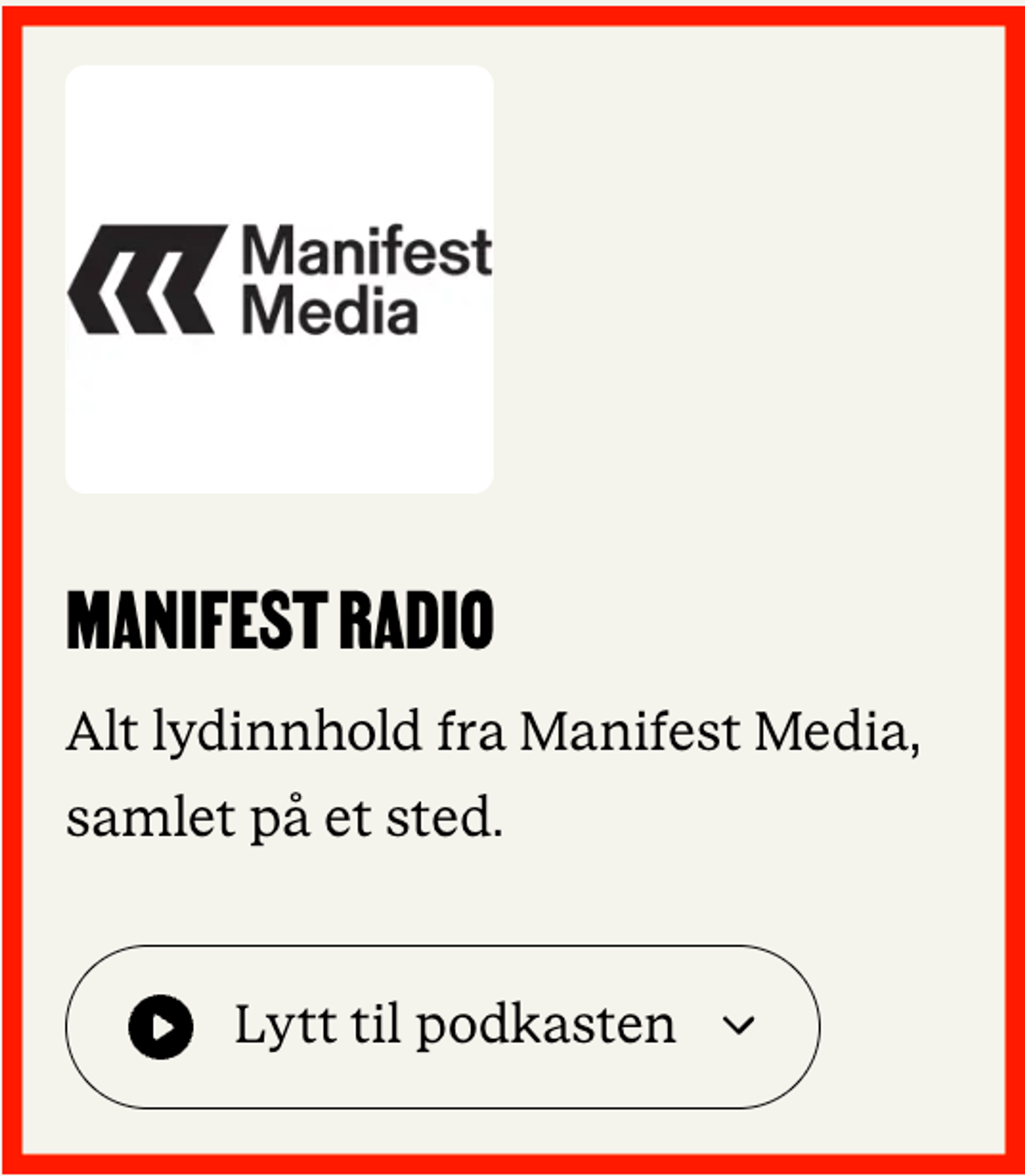 Etter at du har logget inn med Vipps på «Mitt abonnement», vil du se alle våre podkaster. Her ligger det også en podkast som heter «Manifest Radio» som samler alle episodene fra alle podkastene våre i en strøm.